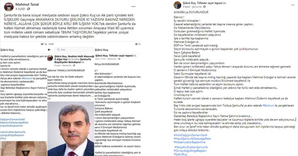 “Tanal, yaptığı açıklamada, “Şanlurfa’da bana sosyal medyada saldıran sayın Şükrü Kuş’un Ak parti içindeki kirli İLİŞKİLERİ Geçmişte ANKARAYA DUYURU ŞEKLİNDE Kİ YAZISINI BAKINIZ NEREDEN NEREYE…ALLAHA ÇOK ŞÜKÜR BÖYLE KİRLİ BİR İLİŞKİM YOK.Tek derdim Şanlurfa da halkın hizmet almaması nedeniyle bana iletilen sorunları Anayasa Mad 80 uyarınca tüm milletin vekili olmam sebebiyle TBMM TAŞIYORUM.Teşekkür yerine ,sosyal medyada haksız bir şekilde saldırmalarını anlamış değilim”