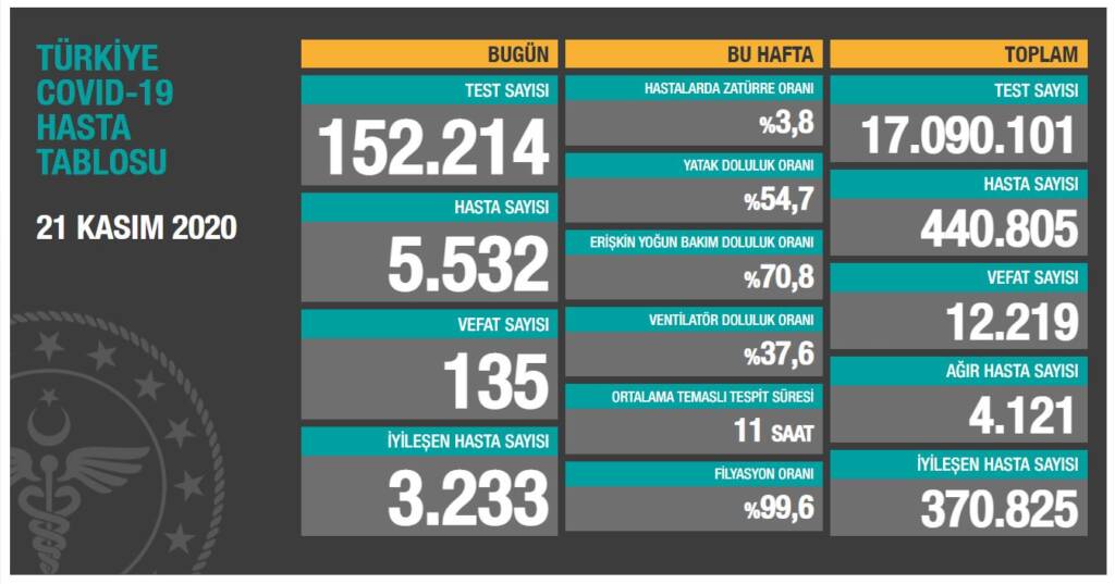 Sağlık Bakanı Fahrettin Koca, verilere ilişkin yaptığı açıklamada, “Bugün tespit edilen 5.532 yeni hasta var. Ağır hasta sayımız da kayıplarımız da can yakıyor. Kayıplarımızı azaltacak olan kurallara ve tedbirlere canla başla uymaktır. Mücadelenin gücü birlik olmak. Güç verin.” dedi.
