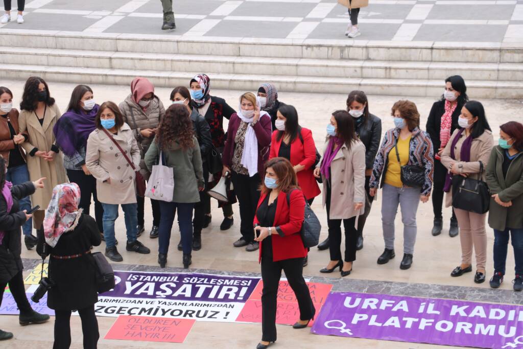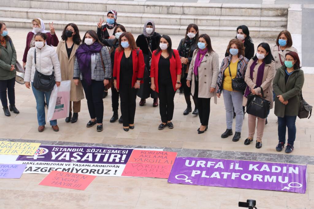 Şanlıurfa’da İnsan Hakları Derneği (İHD), Kamu Emekçileri Sendikaları Konfederasyonu (KESK), Şanlıurfa Barosu Kadın Hakları Komisyonu, Yaşamevi Kadın Dayanışma Derneği, HDP ve CHP’nin kadınları tarafından kurulan İl Kadın Platformu, 25 Kasım Kadına Yönelik Şiddete Karşı Uluslararası Mücadele Günü dolayısıyla Ahmet Bahçıvan İş Merkezi önünde toplanarak basın açıklaması yaptı.
