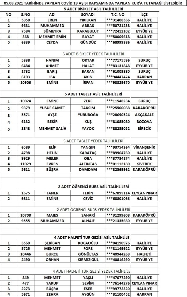 Şanlıurfa’da aşılama oranı yüzde 50’nin üzerine çıkana kadar devam edecek hediye kampanyası çekilişleri, her hafta perşembe günleri noter huzurunda yapılacak. 18-25 yaş arası aşı olan gençlere 5 bisiklet ve 5 tablet bilgisayar, üniversitede eğitim gören 2 gence okul dönemini kapsayacak şekilde aylık 500 TL burs ile her ay 15 gence bir günlük turistik Halfeti gezisi ve tekne turu hediye edilecek.
