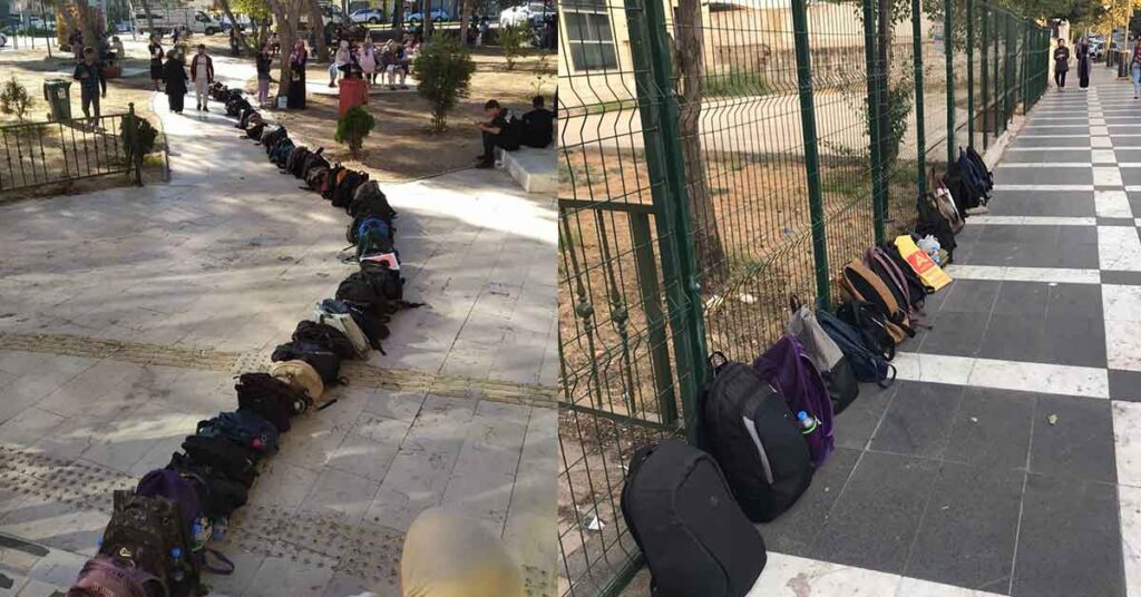 Şanlıurfa’nın Cengiz Topel Mahallesi’nde bulunan İl Halk Kütüphanesi’nde ders çalışabilmek için yer kapmak isteyen gençler, sabahın erken saatlerinden itibaren kütüphanenin yolunu tutuyor. Kuyrukta beklemekten yorulan üniversite, alan ve KPSS sınavlarına girecek adaylar çare olarak kendileri değil, çantalarını sıraya sokmakta buldu. Kütüphanede yeterli yer olmadığı için bu yolu seçen gençler, kapılar açıldığında çantalarının bulunduğu sırayla içeriye girerek ders çalışıyor.