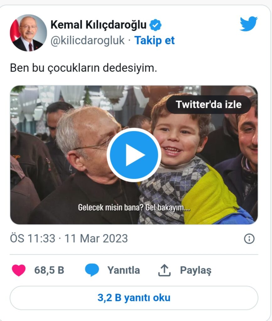 CHP lideri ve Cumhurbaşkanı Adayı Kılıçdaroğlu, sosyal medya hesabından yaptığı paylaşımına “Ben bu çocukların dedesiyim” notunu düştü.