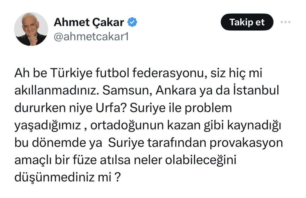 Türkiye Futbol Federasyonu’nun (TFF) Süper Kupa’nın Şanlıurfa’da oynanacağını açıklamasının ardından eski hakem ve spor yorumcusu Ahmet Çakar, Şanlıurfa’yı hedef alan bir paylaşımda bulundu. Çakar’ın alaycı paylaşımı binlerce Şanlıurfalıdan tepki mesajı alırken, Çakar özür dilemeden paylaşımını sessizce sildi.